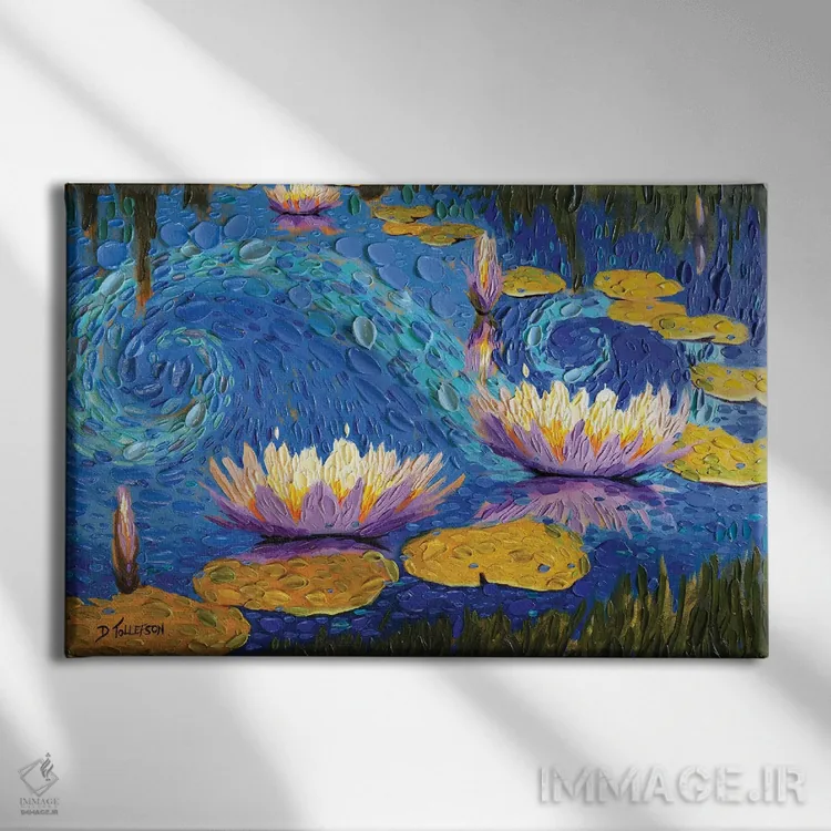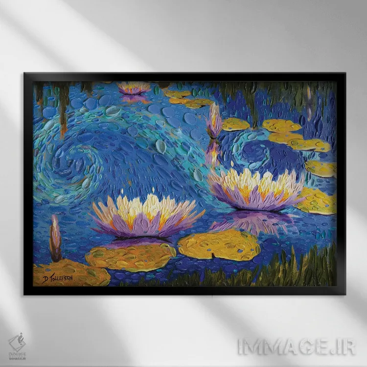 این اثر با عنوان «برکه سوسنهای بنفش» اثرِ «دنا تولفسون» فضا را نرمتر و مهماننوازتر میکند؛ برای فضای غذاخوری انتخابی خوشسلیقه است. با قاب روشن یا چوبی، حس طبیعیتری پیدا میکند.