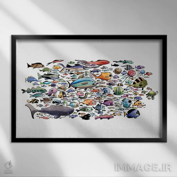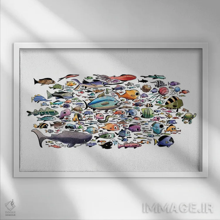 برای دکورهای صمیمی، «ماهیها همه جا هستند» اثرِ «دن تاویس» فضا را صمیمیتر و دعوتکنندهتر نشان میدهد؛ برای خانههایی با چوب و پارچههای گرم انتخابی خوشسلیقه است. هم فضا را گرم میکند، هم شلوغش نمیکند.