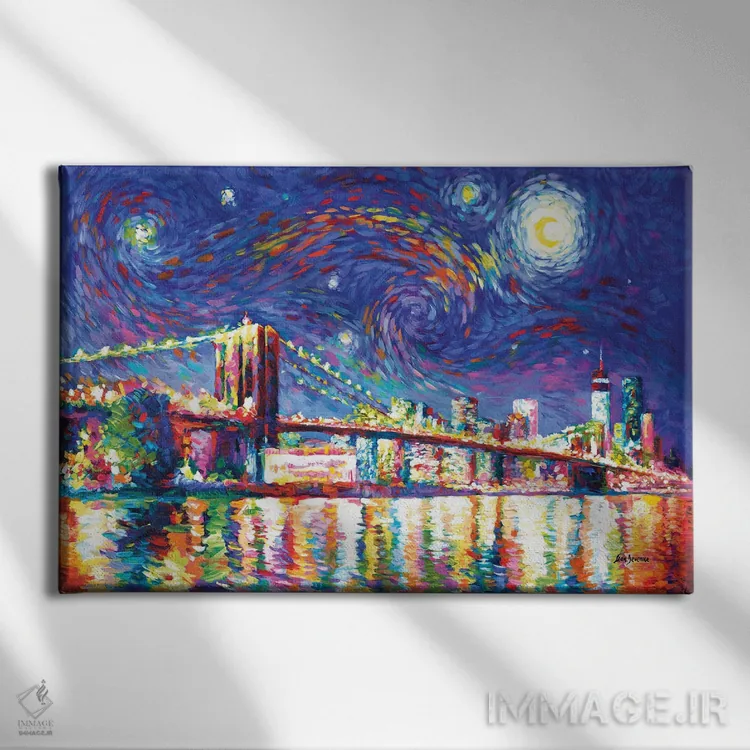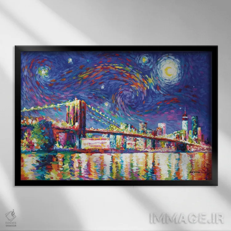 «شب پرستاره بر فراز پل بروکلین» اثرِ «لئون دوونیس» میتواند یک زیباییِ دقیق و حرفهای بسازد؛ برای لابی و فضاهای رسمی پیشنهاد شود. با قاب مشکی مات، جلوهٔ تمیزتری پیدا میکند.