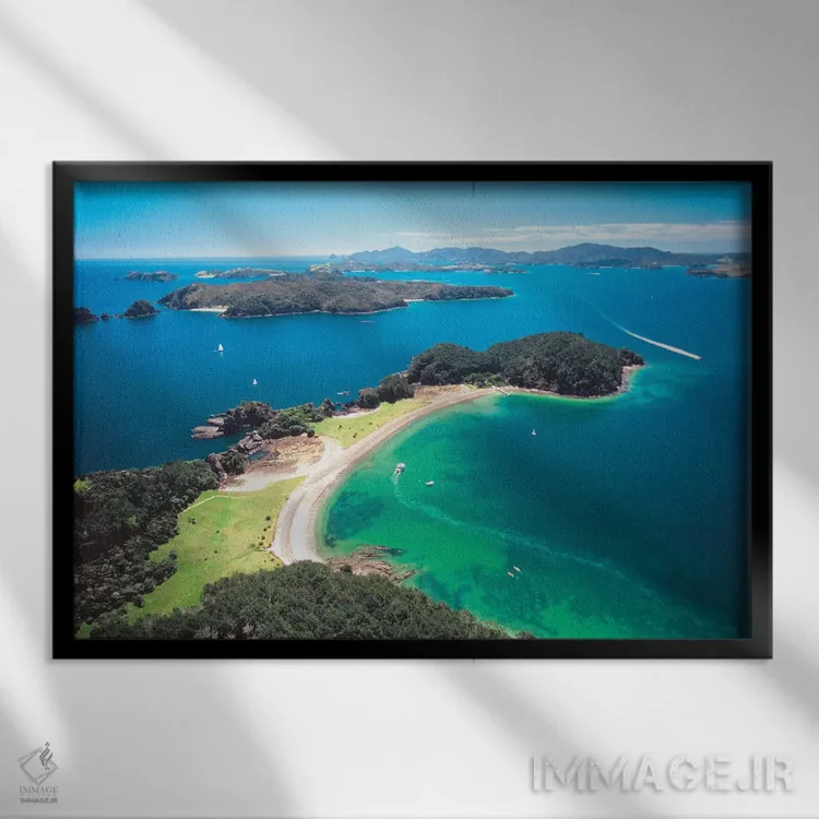 وقتی چیدمان را با دقت میچینید، «نمای هوایی، خلیج جزایر، منطقه نورثلند، جزیره شمالی، نیوزیلند» اثرِ «دیوید وال» جلوهٔ اتاق را یک پله حرفهایتر میکند؛ برای فضاهایی که میخواهید مرکز توجه داشته باشند پیشنهاد میشود. هم از دور چشمگیر است و هم از نزدیک پرداخت دارد.
