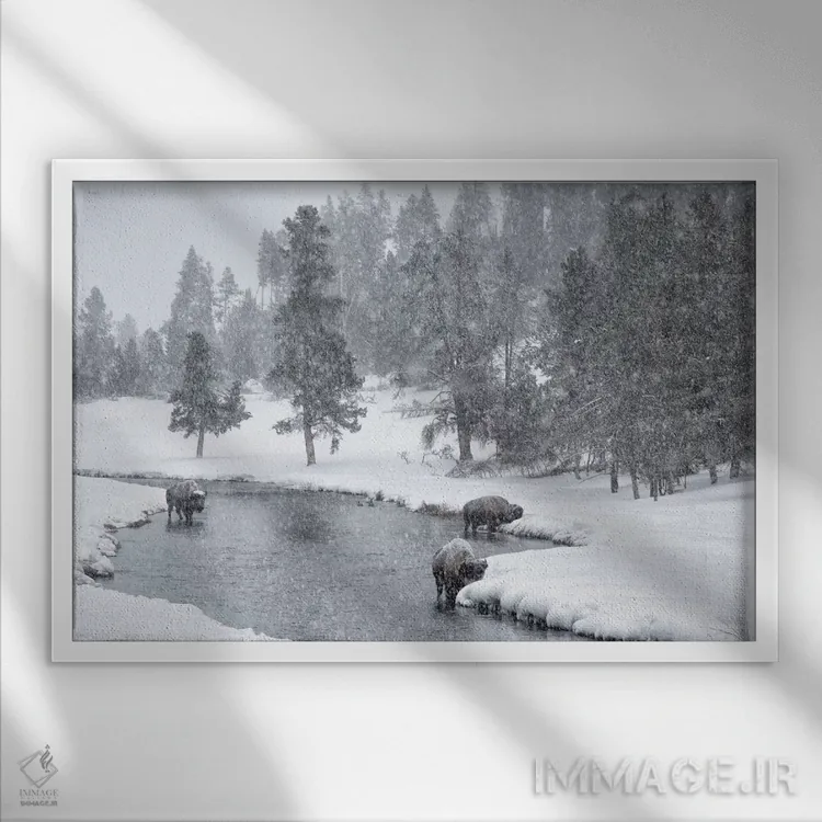 در «Nez Perce River، Yellowstone National Park، Wyoming. Bison in a snowstorm along the Nez Perce.، ایالات متحده، رودخانه نز پرس، پارک ملی یلواستون، وایومینگ. گاومیش آمریکایی در طوفان برف در امتداد نز پرس» اثرِ «دبورا وینچستر»، زیبایی در جزئیات است؛ اثری مناسب برای دیوارهای نزدیک و قابلدیدن از فاصلهی کوتاه.
