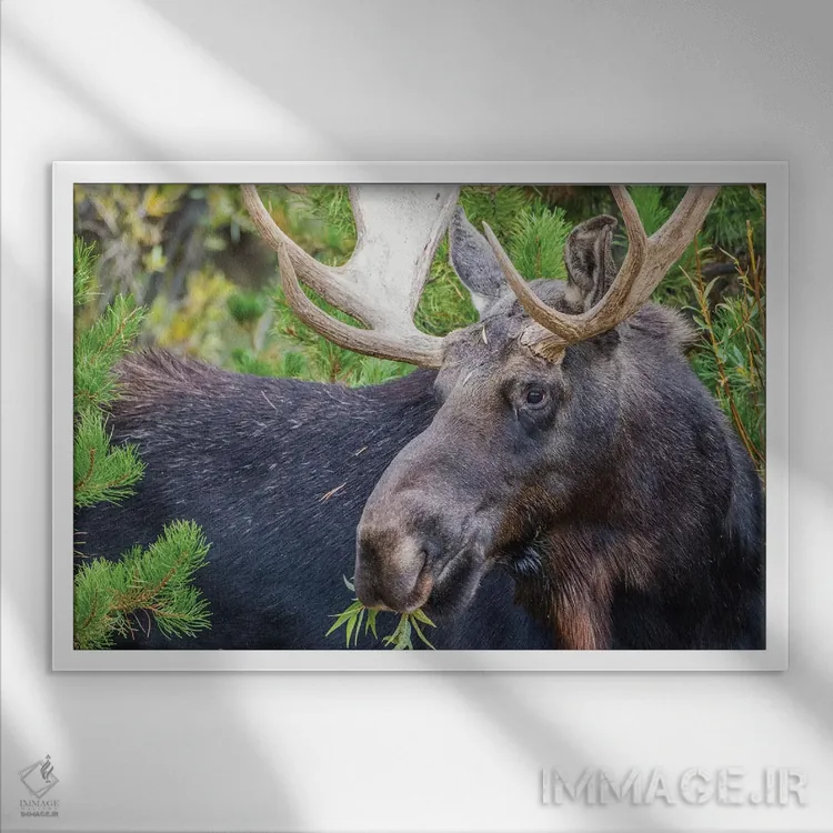 تابلو آمریکا، وایومینگ، شهرستان سابلت، گوزن نر آمریکایی مشغول خوردن از بوته بید اثر الیزابت بوم - نمای قاب‌دار سفید