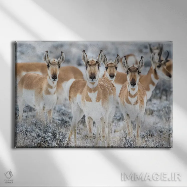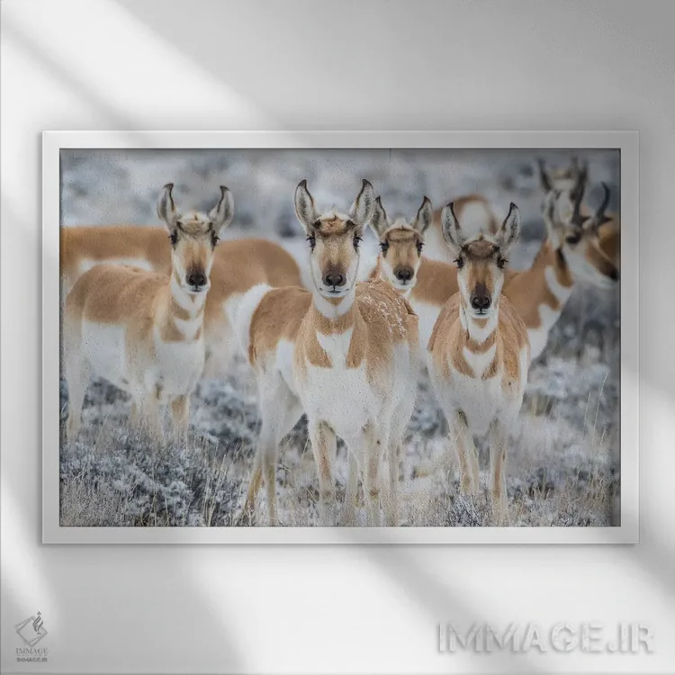 در «وایومینگ، شهرستان سابلت. گروهی کنجکاو از شاخبریها ایستاده در بوتههای مریمگلی در زمستان» اثرِ «الیزابت بوم»، حضور حیوانات بافت و جزئیات را طوری نشان میدهد که نگاه میماند؛ برای کافههای کوچک و صمیمی انتخابی خوشسلیقه است. با قاب چوبی یا مشکی، حس مرتبتری پیدا میکند.