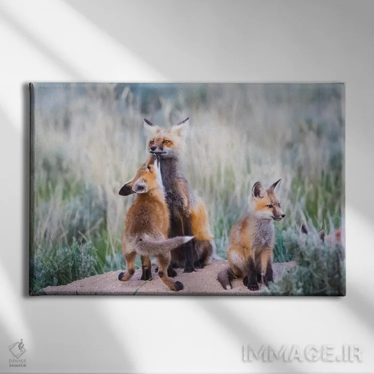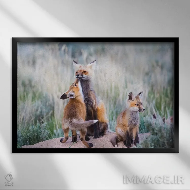 تابلو وایومینگ، شهرستان سابلت. توله روباه سرخ با بوسه‌ای از مادرش استقبال می‌کند هنگام بازگشت او به لانه اثر الیزابت بوم - نمای روبه‌رو روی دیوار