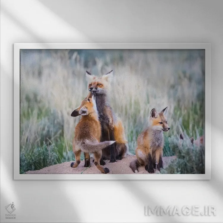 تابلو وایومینگ، شهرستان سابلت. توله روباه سرخ با بوسه‌ای از مادرش استقبال می‌کند هنگام بازگشت او به لانه اثر الیزابت بوم - نمای پرسپکتیو محصول