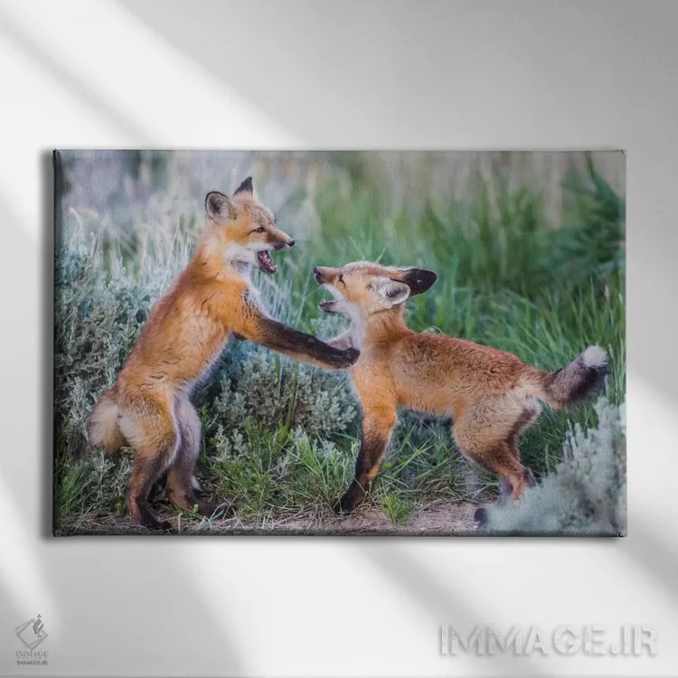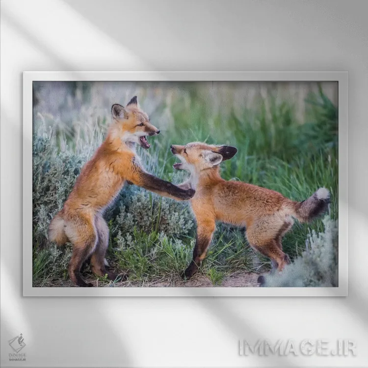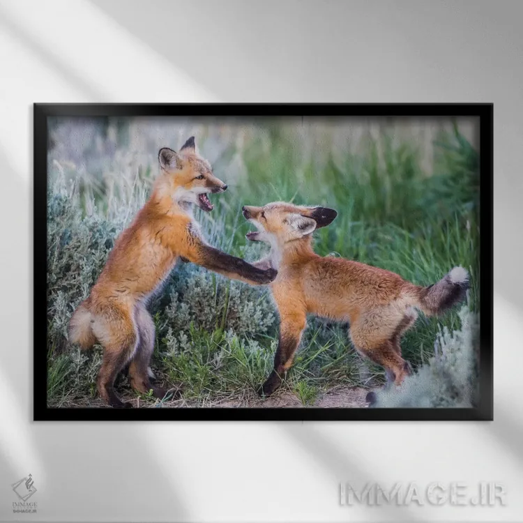 برای دکورهای صمیمی، «وایومینگ، شهرستان سابلت. دو توله روباه سرخ در بوتههای مریمگلی نزدیک لانهشان بازی میکنند» اثرِ «الیزابت بوم» در کنار رنگهای خنثی، تضاد دلچسبی میسازد؛ برای هدیهدادن به دوستداران حیوانات انتخابی خوشسلیقه است. با نورپردازی نقطهای، جذابتر هم میشود.