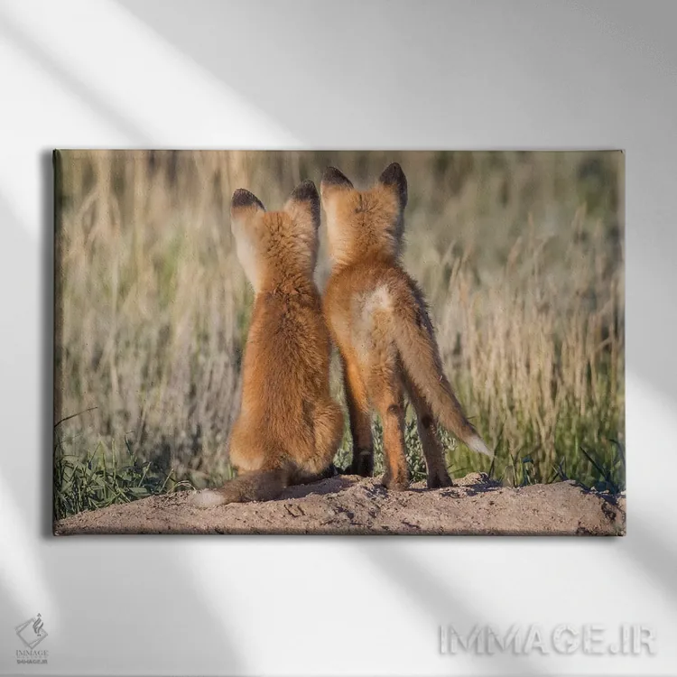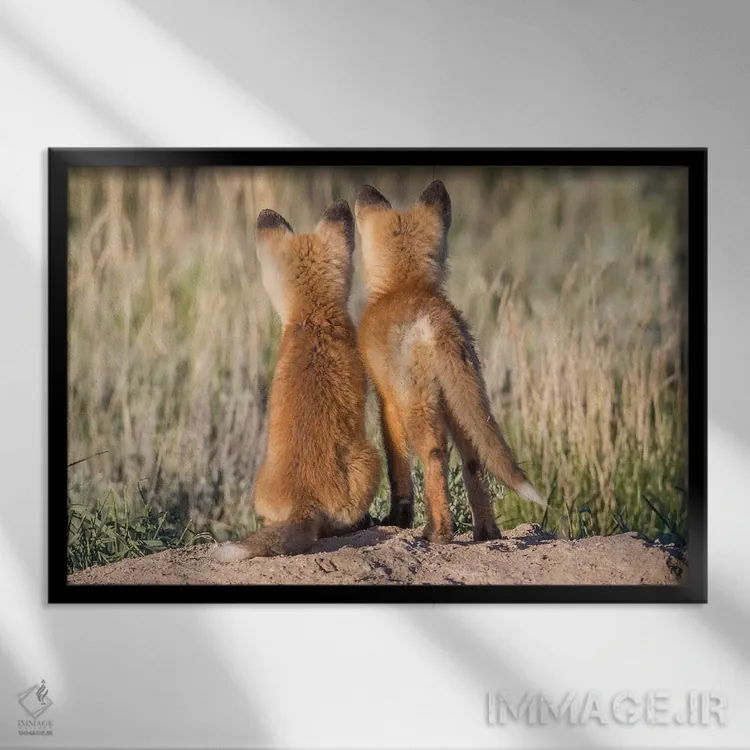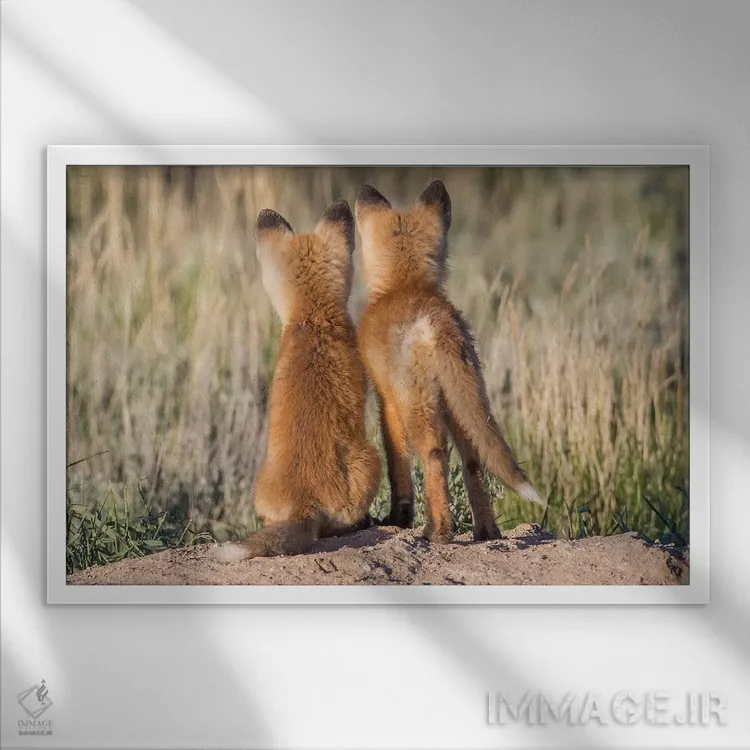 «دو توله روباه جوان از لانه منتظر بازگشت پدر یا مادر خود با غذا هستند، آمریکا، وایومینگ، شهرستان سابلت» اثرِ «الیزابت بوم» میتواند به فضا، گرمیِ ملایم اضافه کند؛ برای خانههایی با چوب و پارچههای گرم پیشنهاد میشود. به دیوار، قصه میدهد—اما قصهای آرام و شیک.