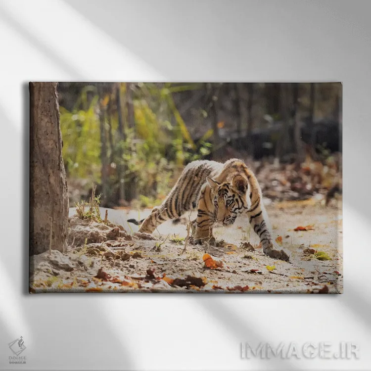 تابلو هند، مادیا پرادش، پارک ملی بندهاوگار. توله ببر بنگال با دقت به دنبال شکار چیزی است اثر الن گاف - نمای روبه‌رو روی دیوار