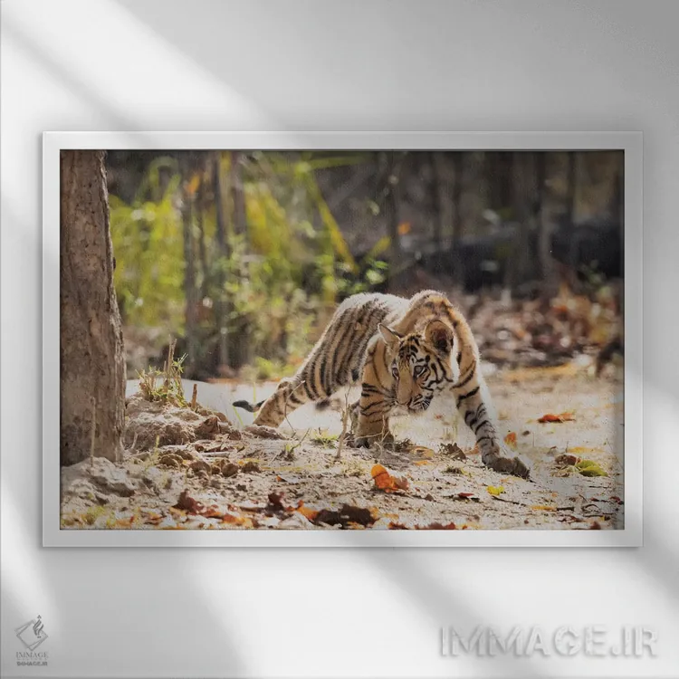 تابلو هند، مادیا پرادش، پارک ملی بندهاوگار. توله ببر بنگال با دقت به دنبال شکار چیزی است اثر الن گاف - نمای قاب‌دار سفید