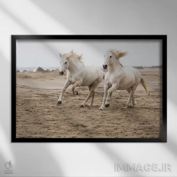 تابلو فرانسه، منطقه کامارگ، سنت-ماری-دو-لا-مر. اسب‌های کامارگ در حال دویدن کنار ساحل اثر الن گاف - نمای قاب‌دار سفید