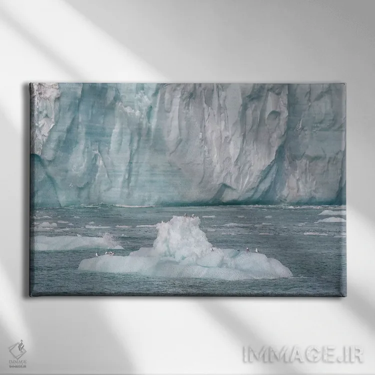 تابلو سوالبارد، جزیره نوردائوستلاندت. یک کوه یخ کوچک جدا شده از یخچال مکانی برای استراحت پرندگان فراهم کرده است اثر الن گاف - نمای روبه‌رو روی دیوار
