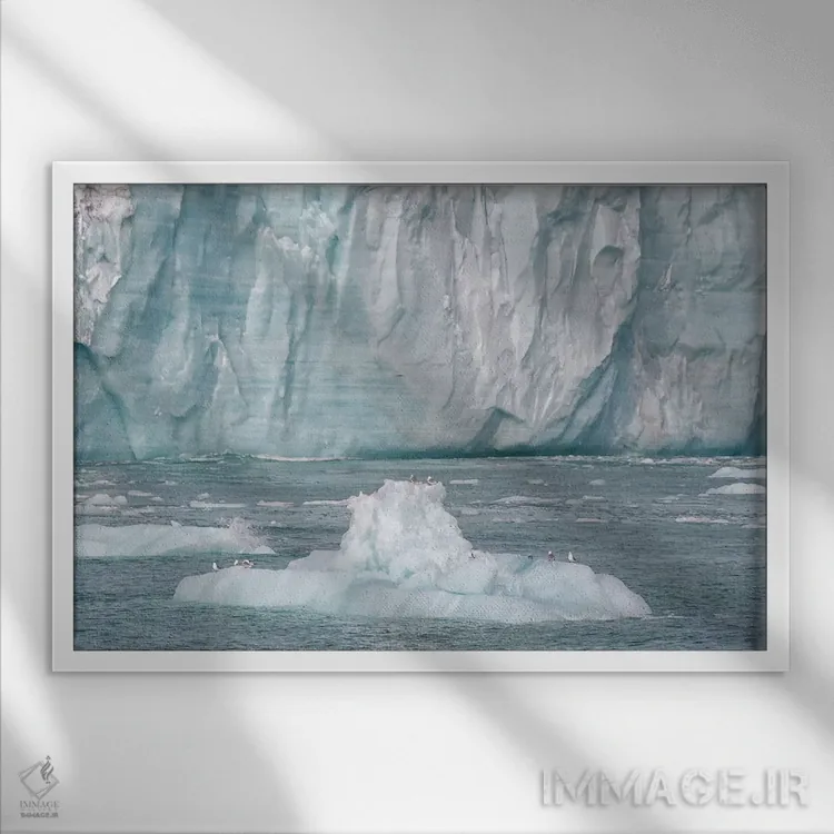 تابلو سوالبارد، جزیره نوردائوستلاندت. یک کوه یخ کوچک جدا شده از یخچال مکانی برای استراحت پرندگان فراهم کرده است اثر الن گاف - نمای قاب‌دار سفید