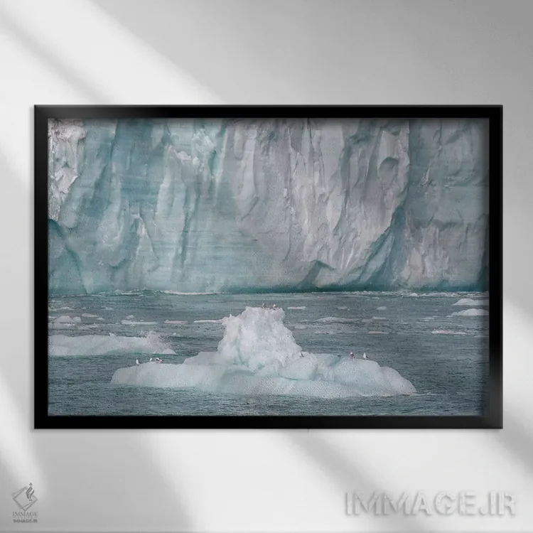 تابلو سوالبارد، جزیره نوردائوستلاندت. یک کوه یخ کوچک جدا شده از یخچال مکانی برای استراحت پرندگان فراهم کرده است اثر الن گاف - نمای قاب‌دار مشکی
