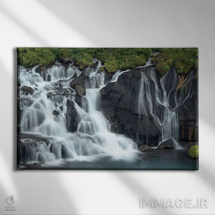 تابلو ایسلند، هراونفوسار. آبشارهای کوچک از دل گدازه‌ها بیرون می‌آیند و در طول نیم‌مایل وارد رودخانه هویتا می‌شوند اثر الن گاف - نمای پرسپکتیو محصول