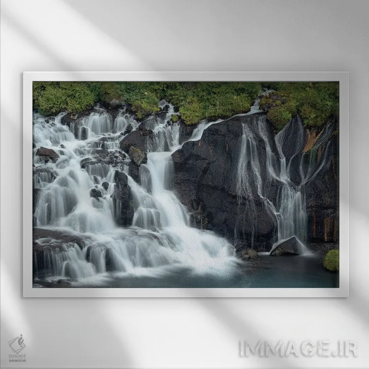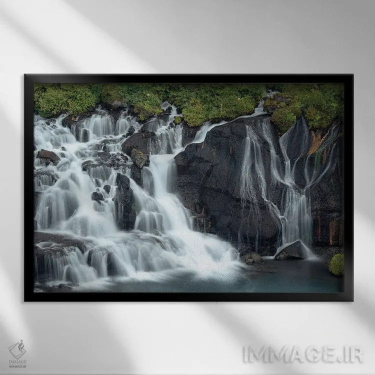 تابلو ایسلند، هراونفوسار. آبشارهای کوچک از دل گدازه‌ها بیرون می‌آیند و در طول نیم‌مایل وارد رودخانه هویتا می‌شوند اثر الن گاف - نمای قاب‌دار مشکی