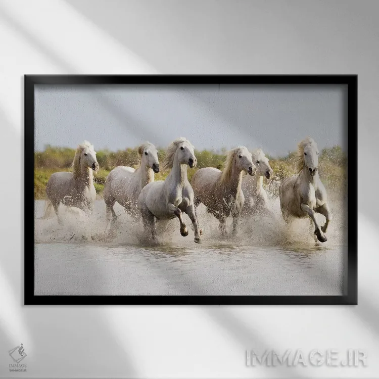 تابلو فرانسه، منطقه کامارگ، سنت-ماری-دو-لا-مر. اسب‌های کامارگ در حال تاختن در آب II اثر الن گاف - نمای روبه‌رو روی دیوار