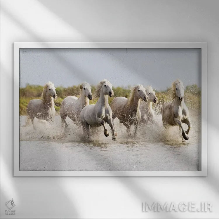 تابلو فرانسه، منطقه کامارگ، سنت-ماری-دو-لا-مر. اسب‌های کامارگ در حال تاختن در آب II اثر الن گاف - نمای قاب‌دار سفید