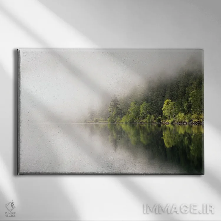 تابلو آمریکا، ایالت واشنگتن، پارک ملی المپیک، دریاچه کرسنت. مه بخشی از دریاچه کرسنت را پوشانده است اثر الن گاف - نمای روبه‌رو روی دیوار