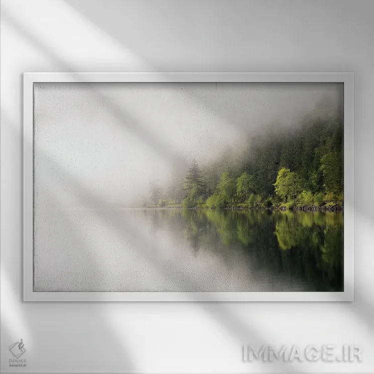 تابلو آمریکا، ایالت واشنگتن، پارک ملی المپیک، دریاچه کرسنت. مه بخشی از دریاچه کرسنت را پوشانده است اثر الن گاف - نمای قاب‌دار سفید