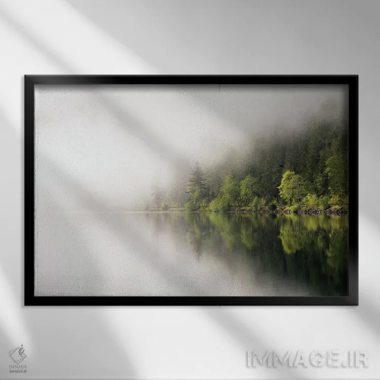 تابلو آمریکا، ایالت واشنگتن، پارک ملی المپیک، دریاچه کرسنت. مه بخشی از دریاچه کرسنت را پوشانده است اثر الن گاف - نمای قاب‌دار مشکی