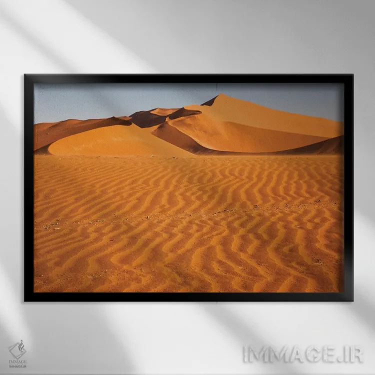 تابلو نامیبیا، پارک ملی نامیب-ناوکلوت، سوسس‌ولی. تپه‌های ماسه‌ای قرمز با نقش‌هایی ایجاد شده توسط باد اثر الن گاف - نمای قاب‌دار مشکی