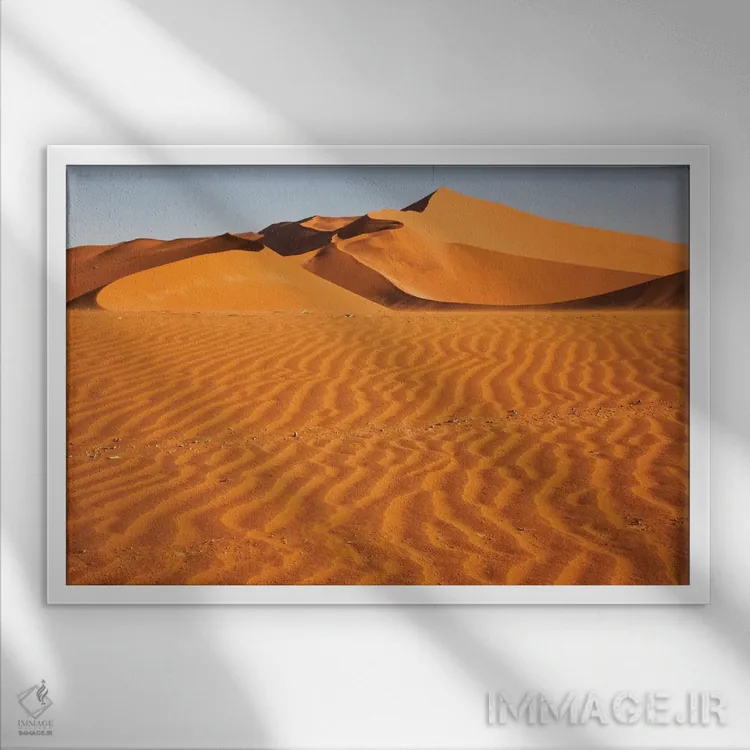 تابلو نامیبیا، پارک ملی نامیب-ناوکلوت، سوسس‌ولی. تپه‌های ماسه‌ای قرمز با نقش‌هایی ایجاد شده توسط باد اثر الن گاف - نمای قاب‌دار سفید
