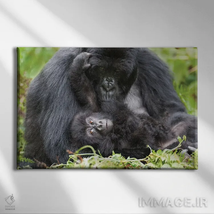 تابلو گوریل کوهی ماده به همراه بچه‌اش، پارک ملی آتشفشان‌ها، رواندا اثر الن گاف - نمای پرسپکتیو محصول