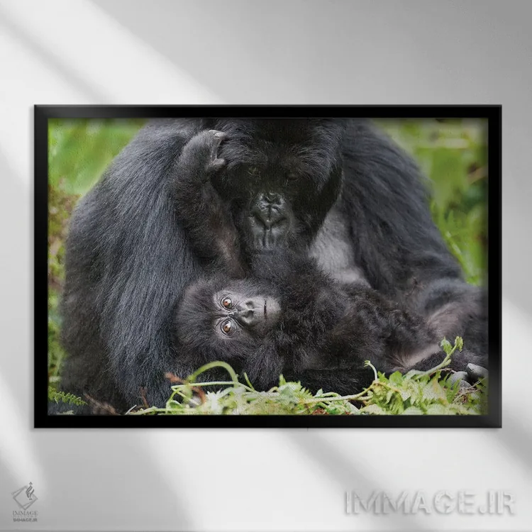 تابلو گوریل کوهی ماده به همراه بچه‌اش، پارک ملی آتشفشان‌ها، رواندا اثر الن گاف - نمای قاب‌دار مشکی