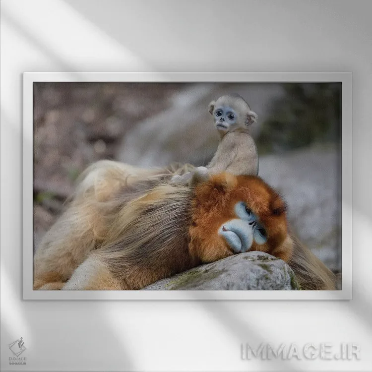 این اثر با عنوان «میمون طلایی بیبینی تازه متولد شده نشسته بر پشت پدرش، ذخیرهگاه طبیعی ملی فوپینگ، استان شاآنشی، چین» اثرِ «الن گاف» در کنار رنگهای خنثی، تضاد دلچسبی میسازد؛ برای کافههای کوچک و صمیمی انتخابی خوشسلیقه است. برای دیوار گالریوار هم گزینهٔ خوبیست.
