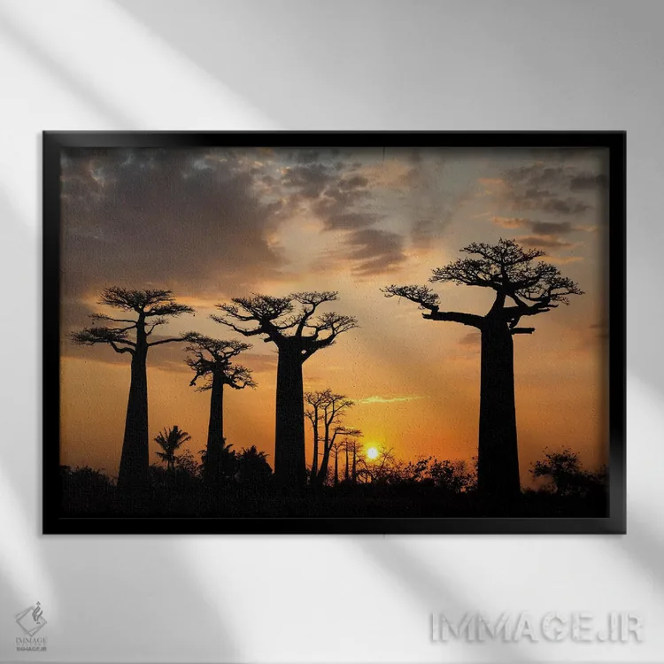 تابلو ماداگاسکار، مورونداوا، مسیر بائوباب‌ها. درخت بائوباب گرندیدیر(ادانسونیا گرندی‌دیه‌ری) در هنگام غروب آفتاب اثر الن گاف - نمای قاب‌دار مشکی