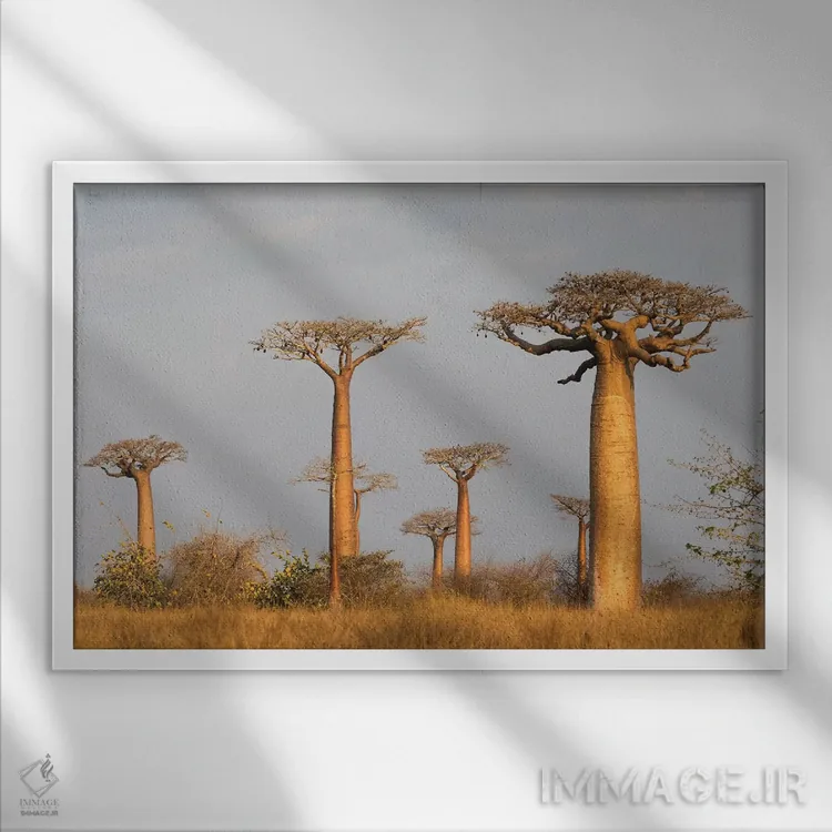 تابلو ماداگاسکار، مورونداوا، مسیر بائوباب‌ها. درخت بائوباب گرندیدیر در نور صبح زود اثر الن گاف - نمای قاب‌دار سفید