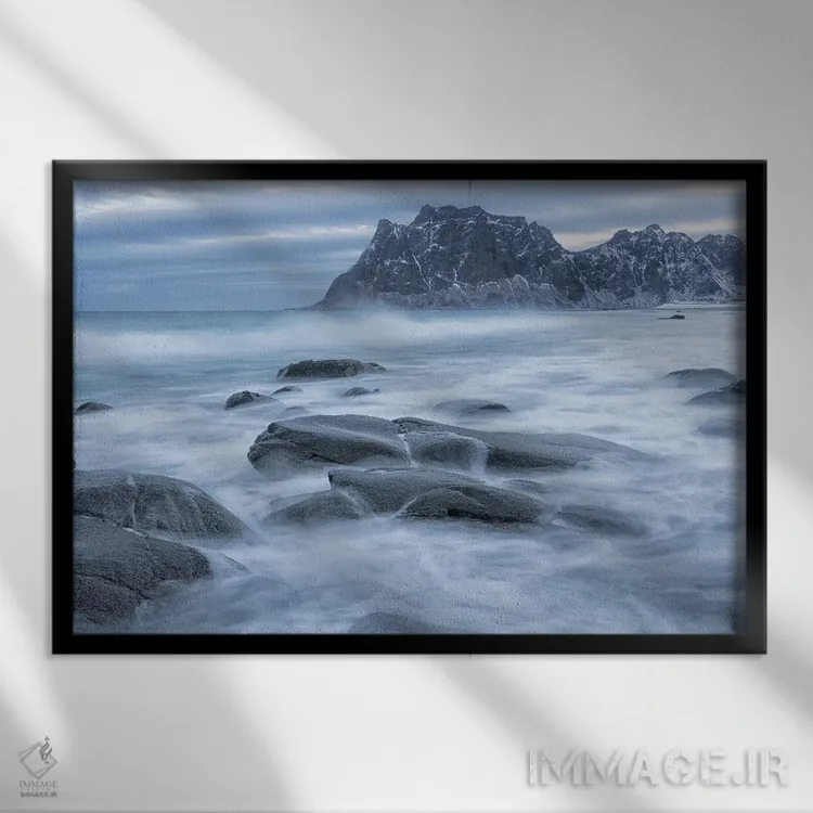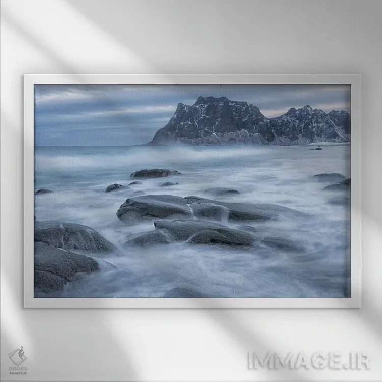 براساس پالت سرد اثر، قاب سفید مات (فریم باریک) پیشنهاد اول است و نقرهای برسخورده (متالیک) مکمل. برای سفارشهای پروژهای با ابعاد و قابهای اختصاصی با ایماژ در تماس باشید.