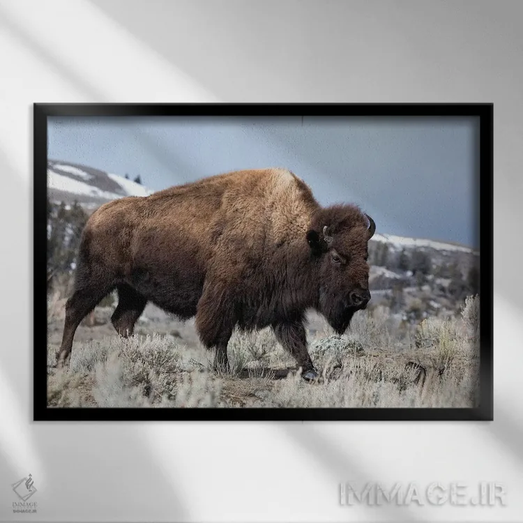 در «آمریکا، وایومینگ، پارک ملی یلواستون. بوفالو از میان بوته مریمگلی و زمین صخرهای عبور میکند» اثرِ «الن گاف»، حضور حیوانات در کنار رنگهای خنثی، تضاد دلچسبی میسازد؛ برای دکورهایی با رنگهای خنثی انتخابی خوشسلیقه است. هر بار نگاهش میکنید، یک جزئیات تازه به چشم میآید.