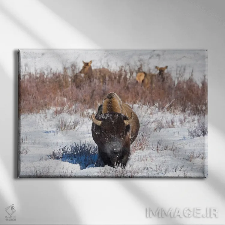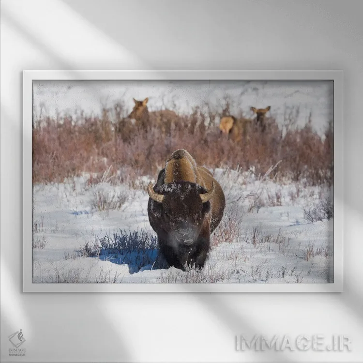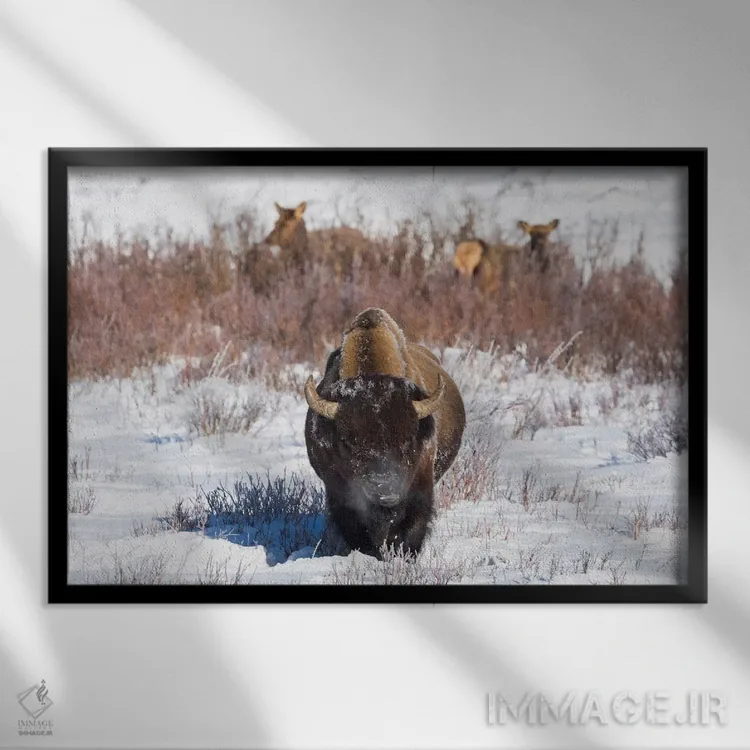 «وایومینگ، پارک ملی یلواستون. یک بوفالوی نر هنگام خوردن چمن توقف میکند، در حالی که دو گوزن ماده مشغول چرا هستند» اثرِ «الن گاف» از آن کارهاییست که در کنار رنگهای خنثی، تضاد دلچسبی میسازد؛ برای دیوار کنار میز کار انتخاب خوبیست. هم فضا را گرم میکند، هم شلوغش نمیکند.
