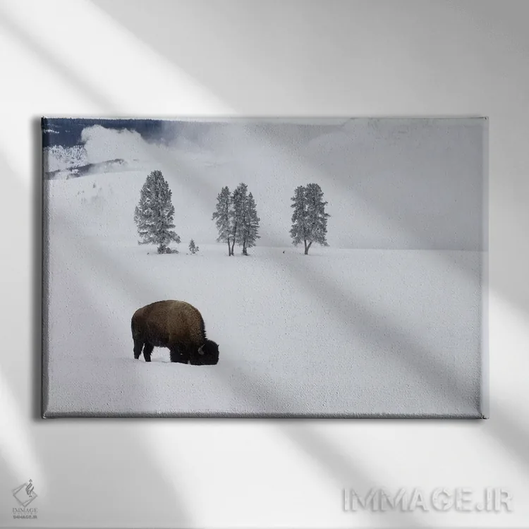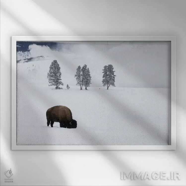 برای دیوارهای ساده، «وایومینگ، پارک ملی یلواستون. بوفالوی آمریکایی نر در زیر برف به دنبال چمن میگردد» اثرِ «الن گاف» بافت و جزئیات را طوری نشان میدهد که نگاه میماند؛ برای اتاق کودک (بدون لحن کودکانه) انتخابی خوشسلیقه است. برای دیوار گالریوار هم گزینهٔ خوبیست.