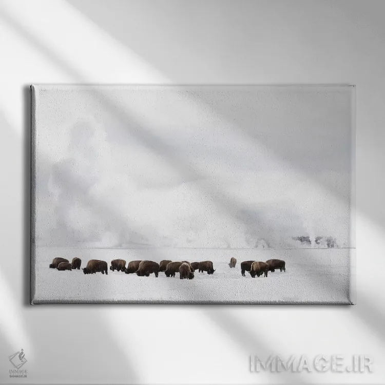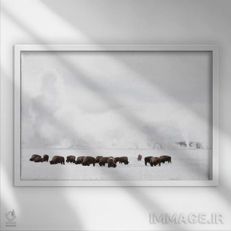 «وایومینگ، پارک ملی یلواستون. گاومیش آمریکایی در حال تلاش برای یافتن علف زیر برف زمستانی.» اثرِ «الن گاف» از آن کارهاییست که در کنار رنگهای خنثی، تضاد دلچسبی میسازد؛ برای دکورهای مدرن و مینیمال انتخاب خوبیست. هر بار نگاهش میکنید، یک جزئیات تازه به چشم میآید.
