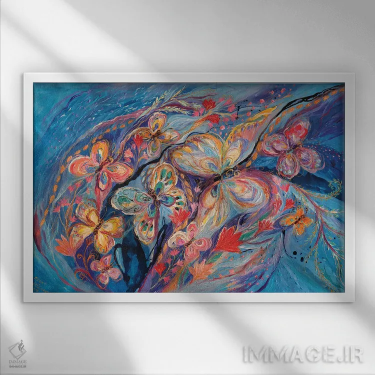 براساس پالت ترکیبی اثر، قاب تیک گرم (چوبی) پیشنهاد اول است و مشکی مات (فریم متوسط) مکمل. برای سفارشهای پروژهای با ابعاد و قابهای اختصاصی با ایماژ در تماس باشید.
