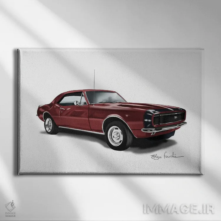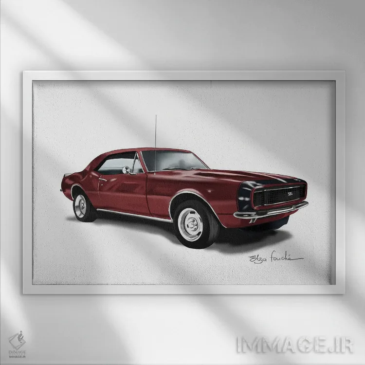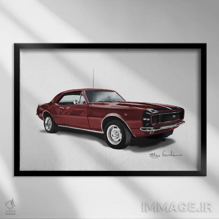 «کامارو زرشکی (مدل خودرو)» اثرِ «الزا فوچه» با حالوهوای این اثر، برای بالای کنسول یا کنار قابهای ساده، ترکیب چشمنوازی میسازد.
