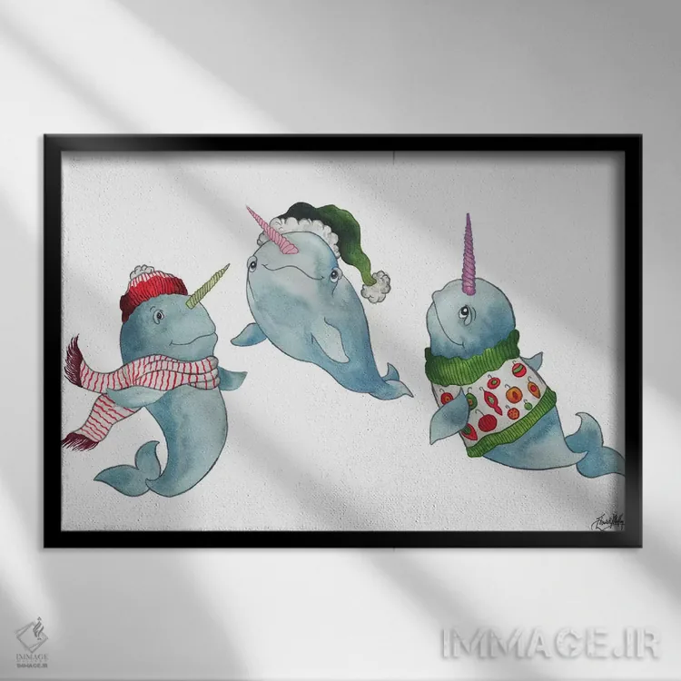 تابلو نارووال‌های کریسمسی اثر الیزابت مدلی - نمای قاب‌دار سفید