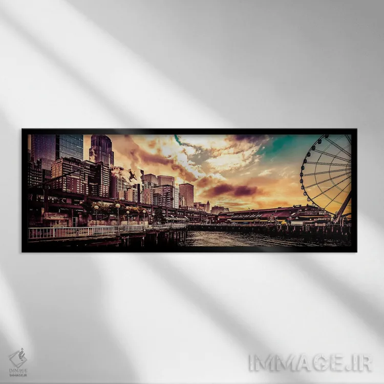 تابلو پانورامای طلوع سیاتل با چرخ بزرگ و اسکله ۵۷ (منظره شهری فیروزه‌ای) اثر نیچر مجیک (برند یا استودیوی هنری) - نمای پرسپکتیو محصول