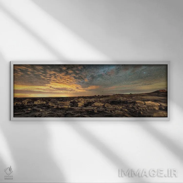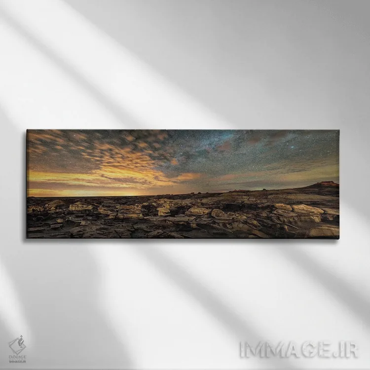 اگر اهل «کم اما درست» هستید، «هودوهای بیستی بدلندز زیر شب پرستاره نیومکزیکو» اثرِ «اولنا آرت (استودیو هنری)» جلوهٔ رنگها را طبیعیتر و متعادلتر نشان میدهد؛ برای دیوار بالای کنسول یا شومینه پیشنهاد میشود. فضا را شلوغ نمیکند؛ فقط دقیقترش میکند.