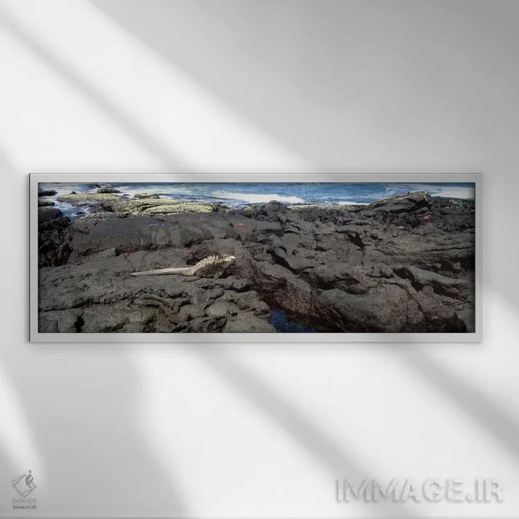 تابلو ایگوانای دریایی (Amblyrhynchus cristatus) بر روی سنگ آتشفشانی، جزیره ایزابل، جزایر گالاپاگوس، اکوادور اثر پانورامیک ایمجز (استودیو عکاسی عریض) - نمای قاب‌دار سفید