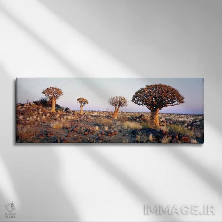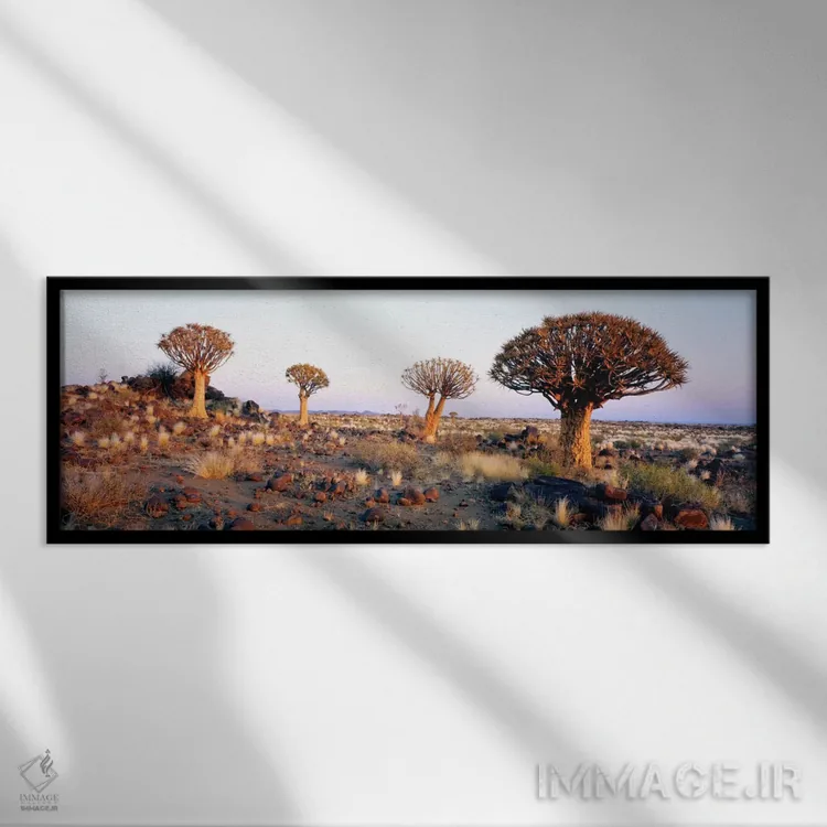 برای دیواری که میخواهید نرمتر دیده شود، «درختان کمان، نامیبیا، آفریقا» اثرِ «پانورامیک ایمجز (استودیو عکاسی عریض)» چیدمان را از خشکی بیرون میآورد؛ برای کافهها و فضاهای آرام انتخابی خوشسلیقه است. حضورش آرام است، اما بیاثر نیست.