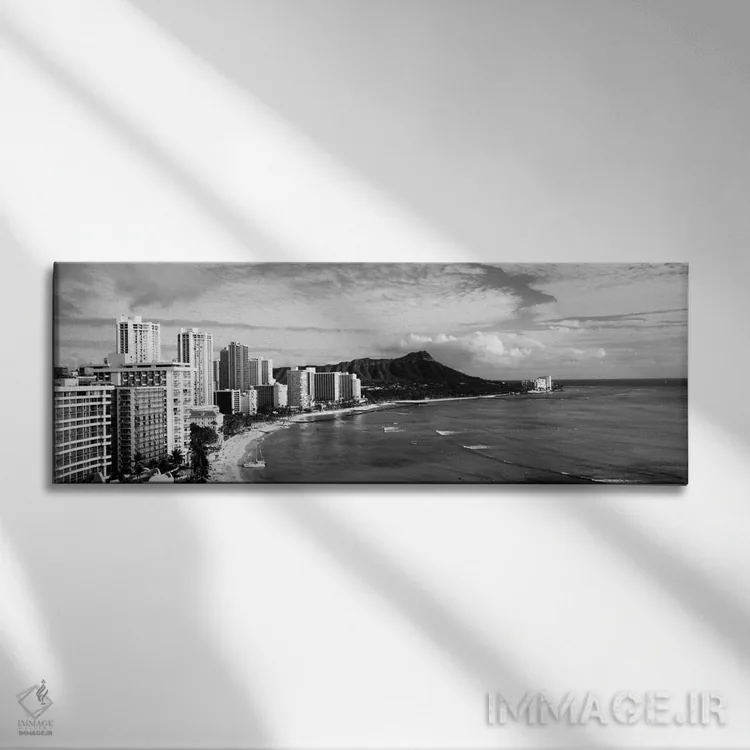 «Diamond Head، Waikiki، Oahu، Honolulu، Hawaii، USA #2"—"ساختمانها در سواحل با کوه آتشفشانی در پسزمینه، دایموند هد، وایکیکی، اوآهو، هونولولو، هاوایی، ایالات متحده آمریکا"» اثرِ «پانورامیک ایمجز (استودیو عکاسی عریض)» در فضای عکاسی سیاهوسفید، روی نور و کنتراست تکیه میکند؛ موضوعِ این اثر برای دکورهای مینیمال عالی است.