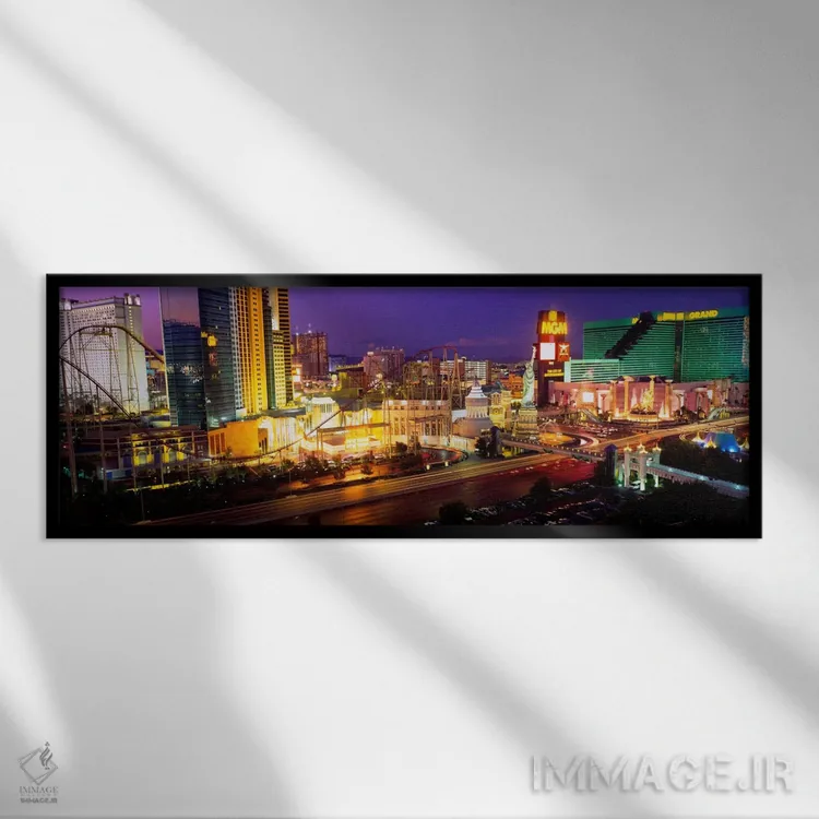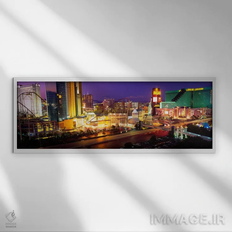 «نمای زاویه بالا از یک شهر، لاس وگاس، نوادا، آمریکا» اثرِ «پانورامیک ایمجز (استودیو عکاسی عریض)» یک قاب دکوراتیوِ گرم و دلنشین است؛ این اثر در اجرای پرداختِ هنری، فضا را نرمتر و صمیمیتر نشان میدهد.