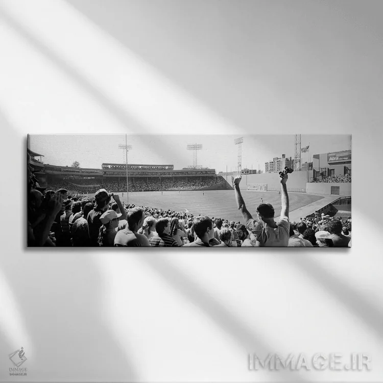 «Massachusetts، Boston، Fenway Park، بوستون، ماساچوست، آمریکا، ورزشگاه فنوی پارک» اثرِ «پانورامیک ایمجز (استودیو عکاسی عریض)» با بیان سیاهوسفید، کنار دیوارهای روشن و قابهای ساده بسیار خوشفرم دیده میشود؛ موضوعِ این اثر هم خوانا میماند.
