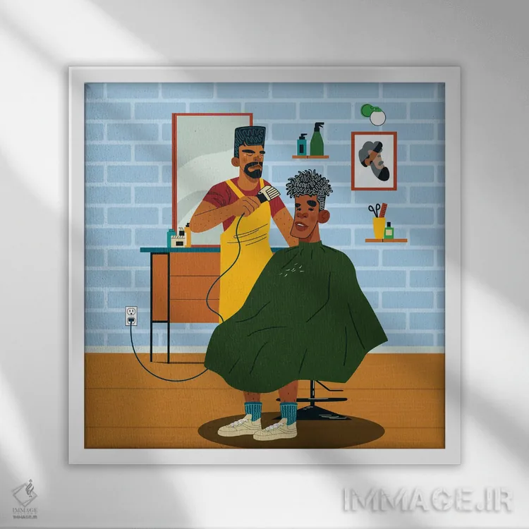 تابلو کمال قیچی (موی آرایشگری) اثر دومونیک براون - نمای قاب‌دار سفید