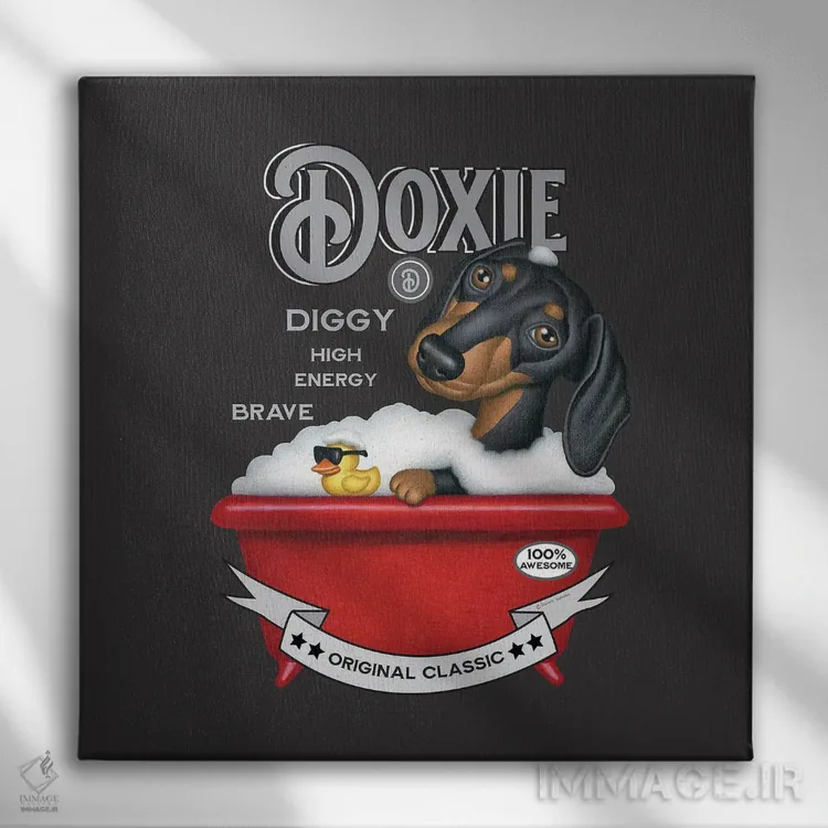 تابلو سگ داشهوند مشکی در وان قرمز به سبک قدیمی اثر دنی گوردون
