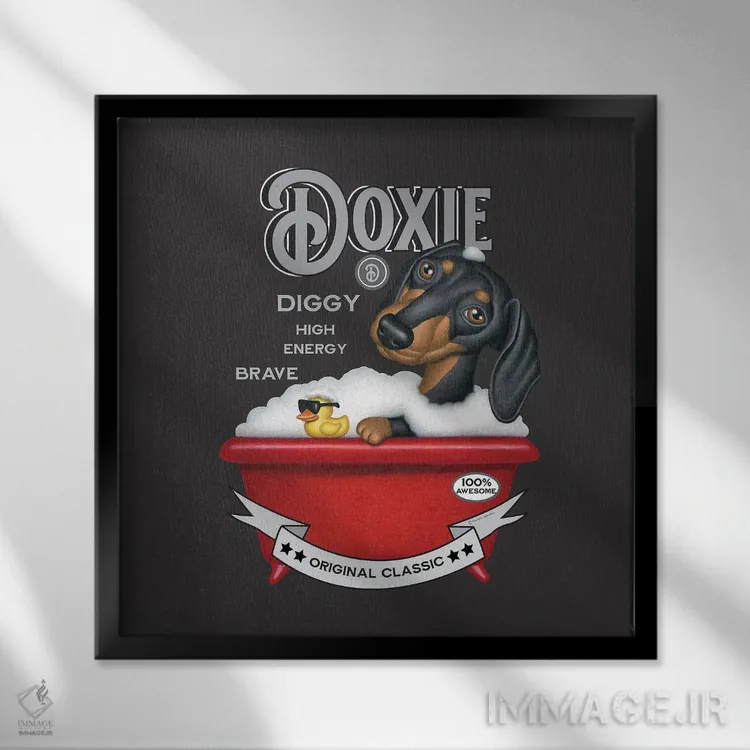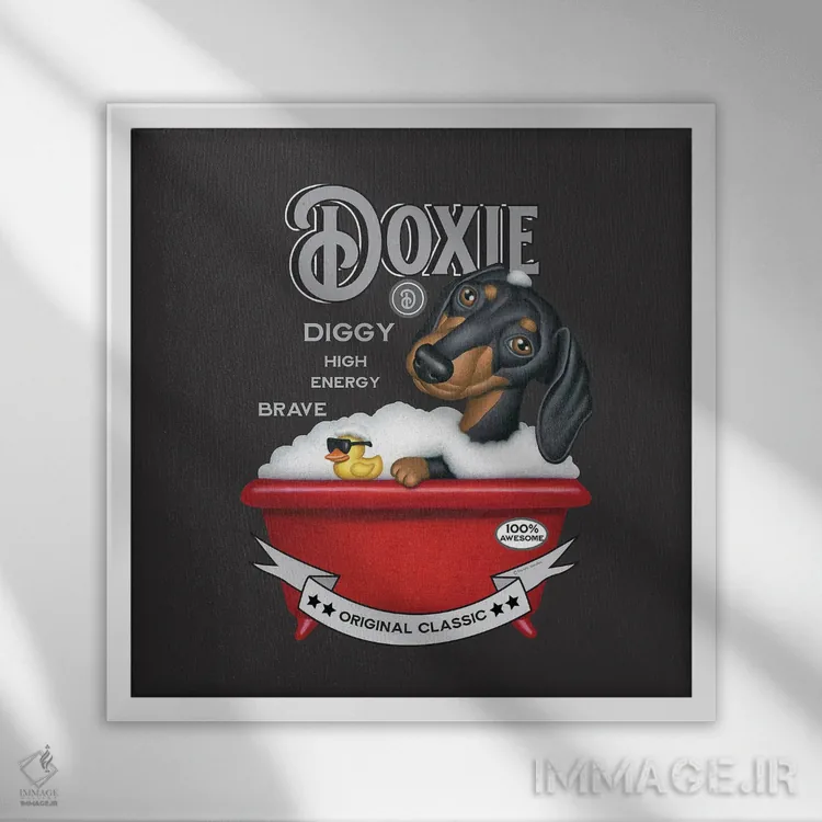 اگر به آثار حیوانات علاقه دارید، «سگ داشهوند مشکی در وان قرمز به سبک قدیمی» اثرِ «دنی گوردون» مثل یک امضای بامزه اما متین عمل میکند، برای دیوار کنار میز کار گزینهٔ مناسبیست. با قاب چوبی یا مشکی، حس مرتبتری پیدا میکند.