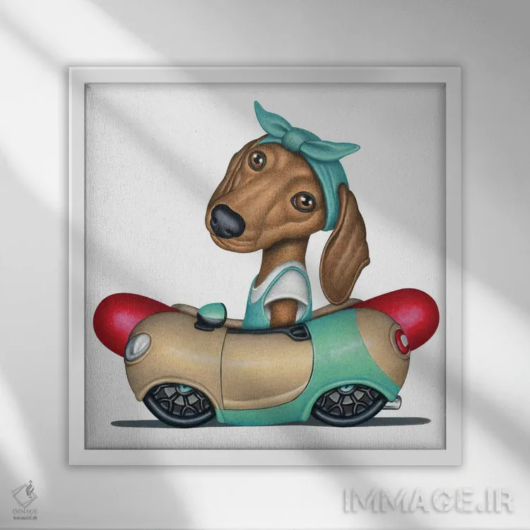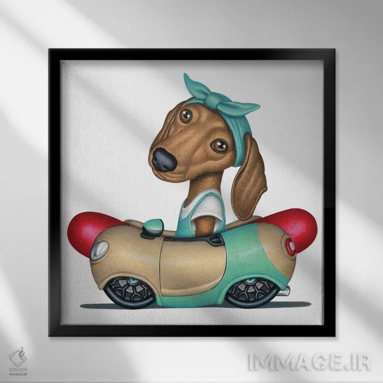 تابلو داشهوند بئاتریس در خودروی هات‌داگ اثر دنی گوردون - نمای قاب‌دار سفید